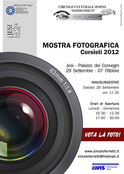 Il Circolo Arci “Massimo Ferretti” organizza al Palazzo dei Convegni di Corso Matteotti a Jesi, una mostra fotografica con i lavori dei corsisti di quest’anno. L’inaugurazione sarà domani sera alle 17.30, mentre la mostra durerà fino al 7 ottobre, aperta tutti i giorni negli orari 10.30-12.30 e 17-20.