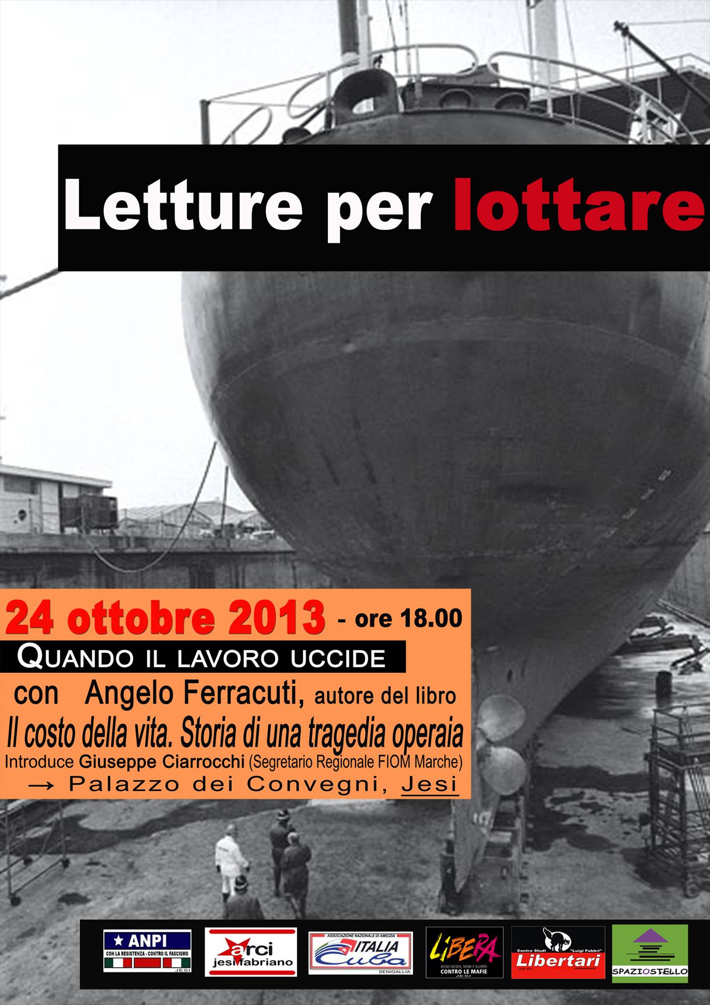 Continua la serie di incontri “Letture per lottare” organizzata da Arci Jesi-Fabriano insieme con l’Anpi Jesi, l’associazione Italia-Cuba di Senigallia, Libera presidio di Jesi, il Centro studi libertari Fabbri e SpaziOstello. Giovedì alle ore 18 presso il Palazzo dei convegni a Jesi, lo scrittore Angelo Ferracuti parlerà del suo libro “Il costo della vita. Storia di una tragedia operaia” (Einaudi) sui tredici operai morti, il 13 marzo del 1987, mentre stavano lavorando nelle stive della nave Elisabetta Montanari, all’interno dei cantieri navali Mecnavi, nel porto di Ravenna. Introdurrà l’incontro il segretario regionale della FIOM Marche Giuseppe Ciarrocchi.