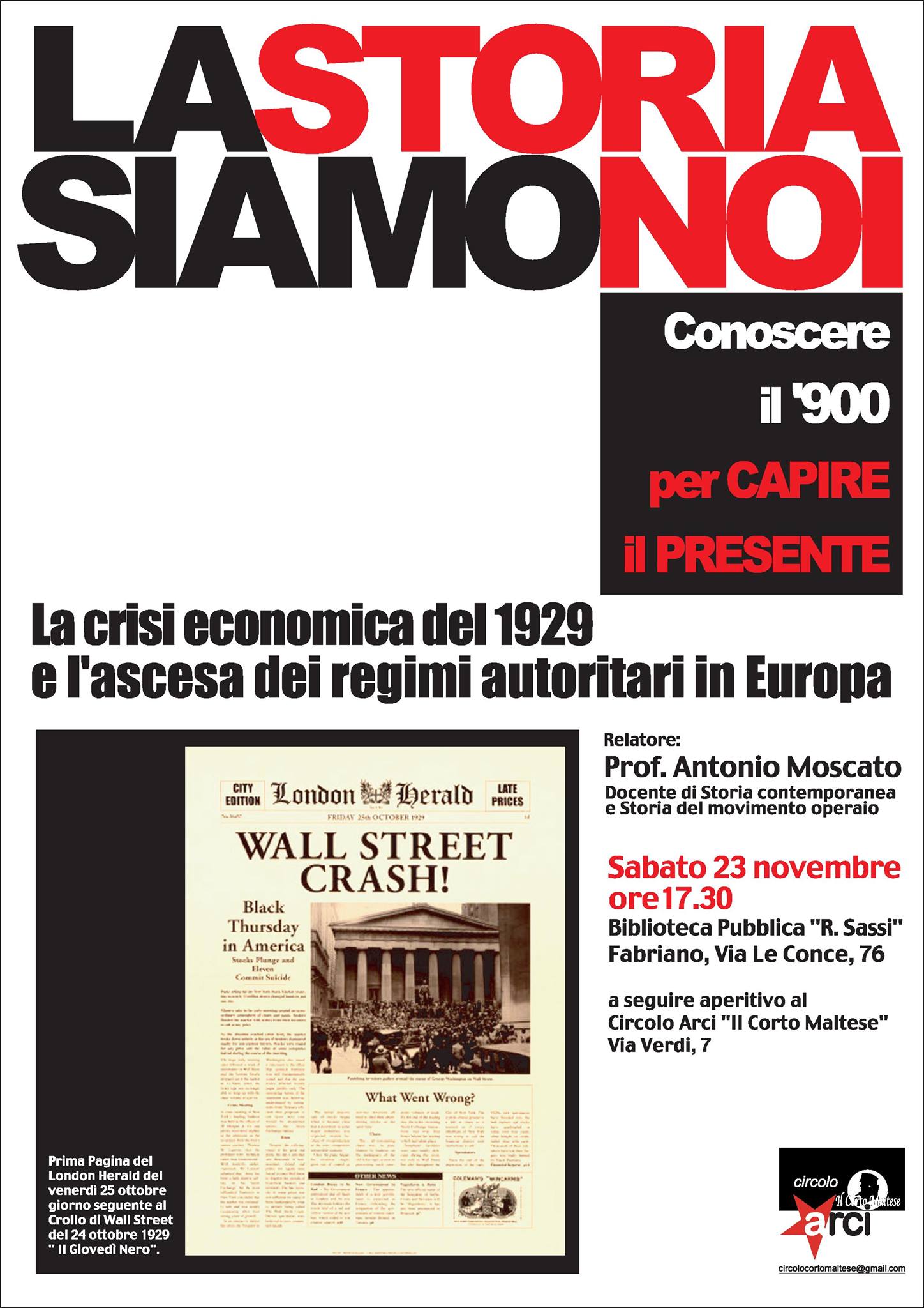 - Il primo appuntamento è sabato, 23 novembre, alle ore 17.30. Il prof Antonio Moscato, docente di Storia contemporanea e storia del movimento operaio, affronterà il tema “La crisi economica del 1929 e l’ascesa dei regimi autoritari in Europa”.