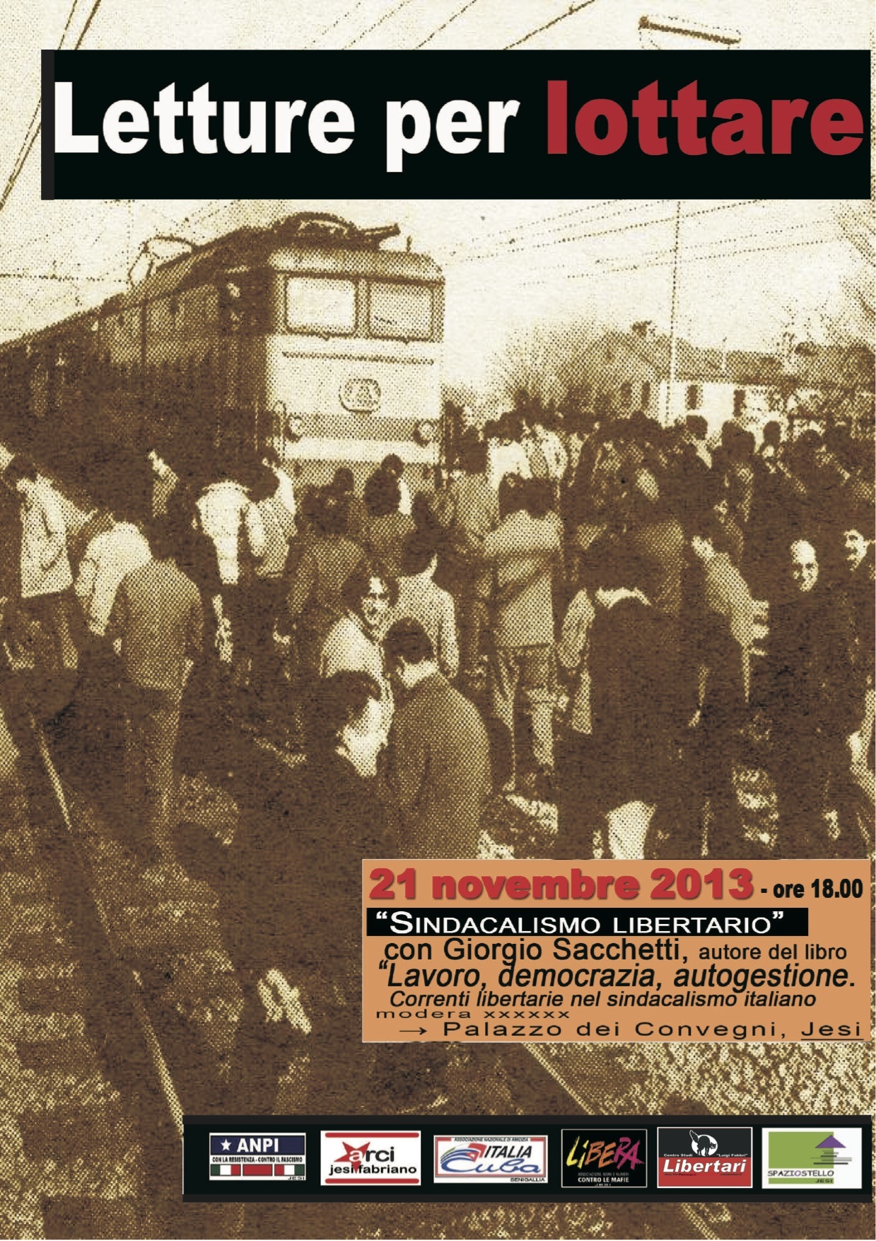 Il messaggio è ben sintetizzato dall’immagine stessa scelta per promuovere l’iniziativa. Ritrae l’occupazione dei binari ferroviari della stazione di Jesi da parte degli operai della SIMA nel lontano 1981, quando un’intera città con i suoi lavoratori si oppose all’inizio di un processo devastante di deindustrializzazione del territorio e perdita di diritti sindacali. La memoria storica e sindacale di quelle lotte e di quella dignità identitaria di classe può essere tema di discussione collettiva, ed è sicuramente risorsa sociale per un futuro migliore.Con il tema del sindacalismo libertario si chiude questo ciclo di incontri, che ha visto una partecipazione di pubblico sempre molto alta in tutte le serate proposte e un’accoglienza ben superiore alle aspettative. Segnali che premiano la scelta “impegnata” delle argomentazioni affrontate: dal ricordo di don Andrea Gallo e della “sua” gente della comunità al porto di Genova tracciato dal fotografo Pino Bertelli, alla tragedia delle morti sul lavoro raccontata dallo scrittore Angelo Ferracuti, alle commistioni tra chiesa e massoneria svelate dal giornalista Giacomo Galeazzi, sino alla narrazione di Giorgio Sacchetti su lavoro, democrazia e autogestione.