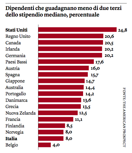 Nel 2013 i tre maggiori datori di lavoro del settore privato negli Stati Uniti erano tutti rivenditori al dettaglio che pagavano salari bassi: Walmart, Yum! Brands (che possiede Taco Bell, Pizza Hut e Kentucky Fried Chicken) e McDonald’s. Nel 1960 i tre maggiori datori di lavoro erano aziende di servizi di pubblica utilità o colossi industriali con dipendenti ben pagati e sindacalizzati: General Motors, At&t e Ford.
