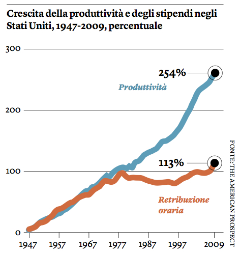 Secondo la teoria economica convenzionale questi incrementi produttivi avrebbero dovuto tradursi in consistenti aumenti di stipendio per i lavoratori. Ma la teoria economica convenzionale non tiene conto del potere delle dirigenze aziendali e degli azionisti e della debolezza dei lavoratori. La sociologa Tali Kristal, dell’università israeliana di Haifa, spiega che dal 1970 la quota di ricavi destinata a salari e previdenza nel settore manifatturiero è scesa del 14 per cento, a fronte di una crescita di pari misura della quota dei profitti. Un fenomeno simile si registra nei trasporti, dove la quota dei salari si è ridotta del 10 per cento, e nell’edilizia, dove è scesa del 5 per cento. Ad accomunare questi settori è il dimezzamento del tasso di sindacalizzazione negli ultimi quarant’anni. Gli incrementi di produttività sono stati spartiti secondo la semplice aritmetica del potere.