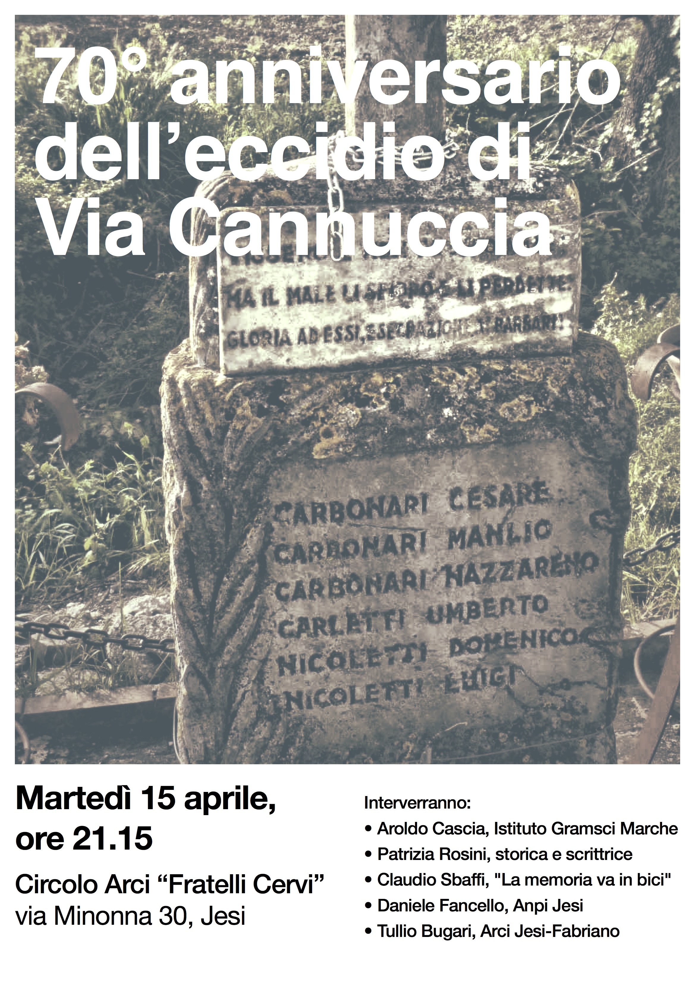 Martedì 15 aprile alle ore 21.15, si terrà presso il circolo Arci “Fratelli Cervi” di Jesi un incontro in occasione del 70° anniversario dell’eccidio dei “martiri di Via Cannuccia”: Carbonari Cesare, Carbonari Manlio, Carbonari Nazzareno, Carletti Umberto, Nicoletti Domenico e Nicoletti Luigi.
