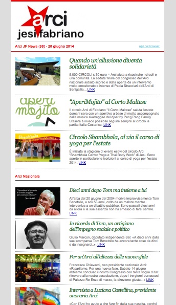 È uscita Arci JF News (98) – 20 giugno 2014, la newsletter numero 98 di Arci Jesi-Fabriano con i prossimi eventi Arci in zona e le notizie dall’Arci nazionale.
