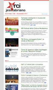 È uscita Arci JF News (108) – 26 settembre 2014, la newsletter numero 108 di Arci Jesi-Fabriano con i prossimi eventi Arci in zona e le notizie dall’Arci nazionale.