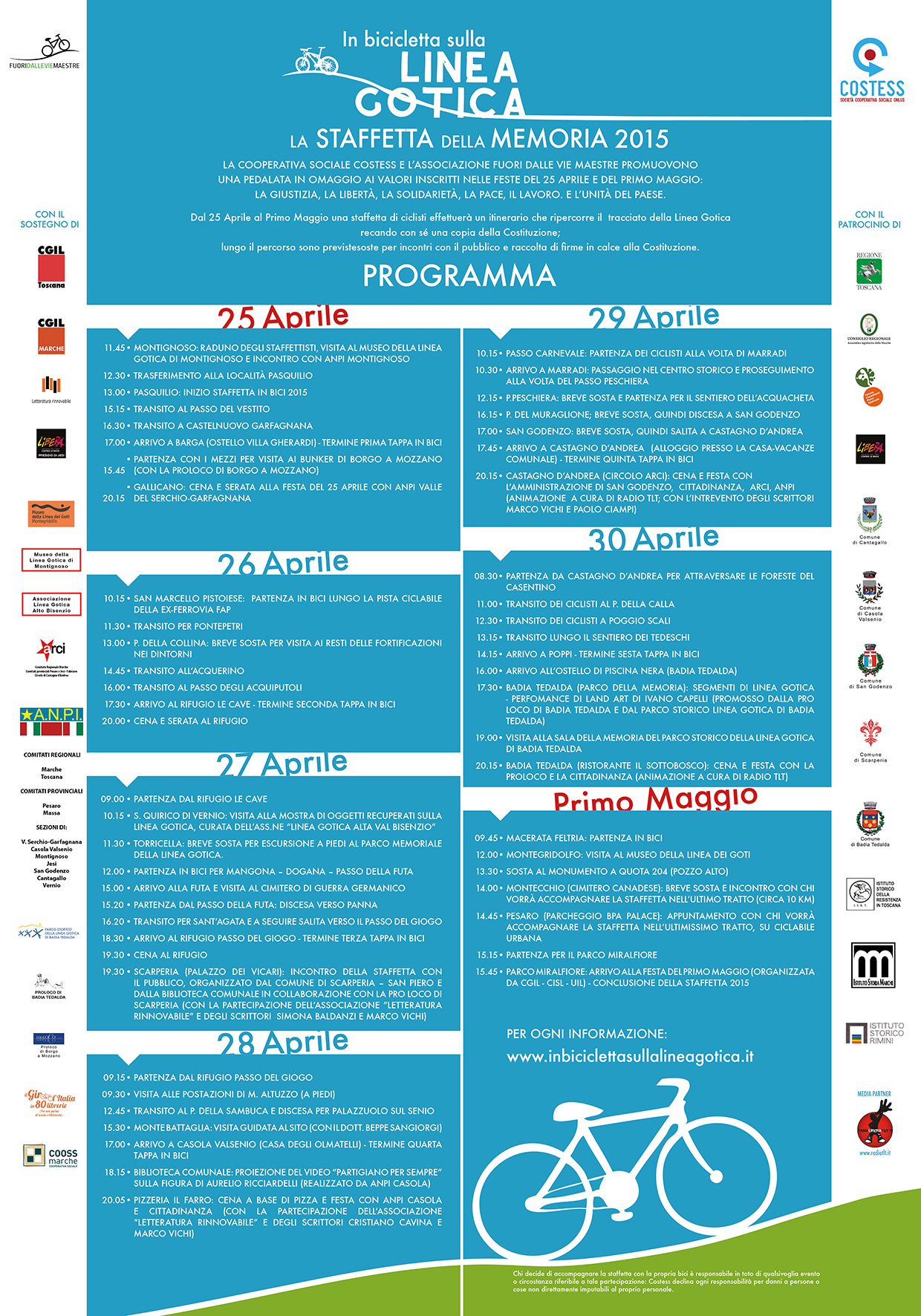 La prima pedalata è prevista la mattina del 25 aprile a Montignoso (Massa), mentre l’ultima si concluderà, dopo circa 400 km sui pedali, il 1° maggio al parco Miralfiore di Pesaro. Dai valori della Resistenza a quelli del lavoro, unendo in un unico itinerario i principi ispiratori della Costituzione della Repubblica Italiana.