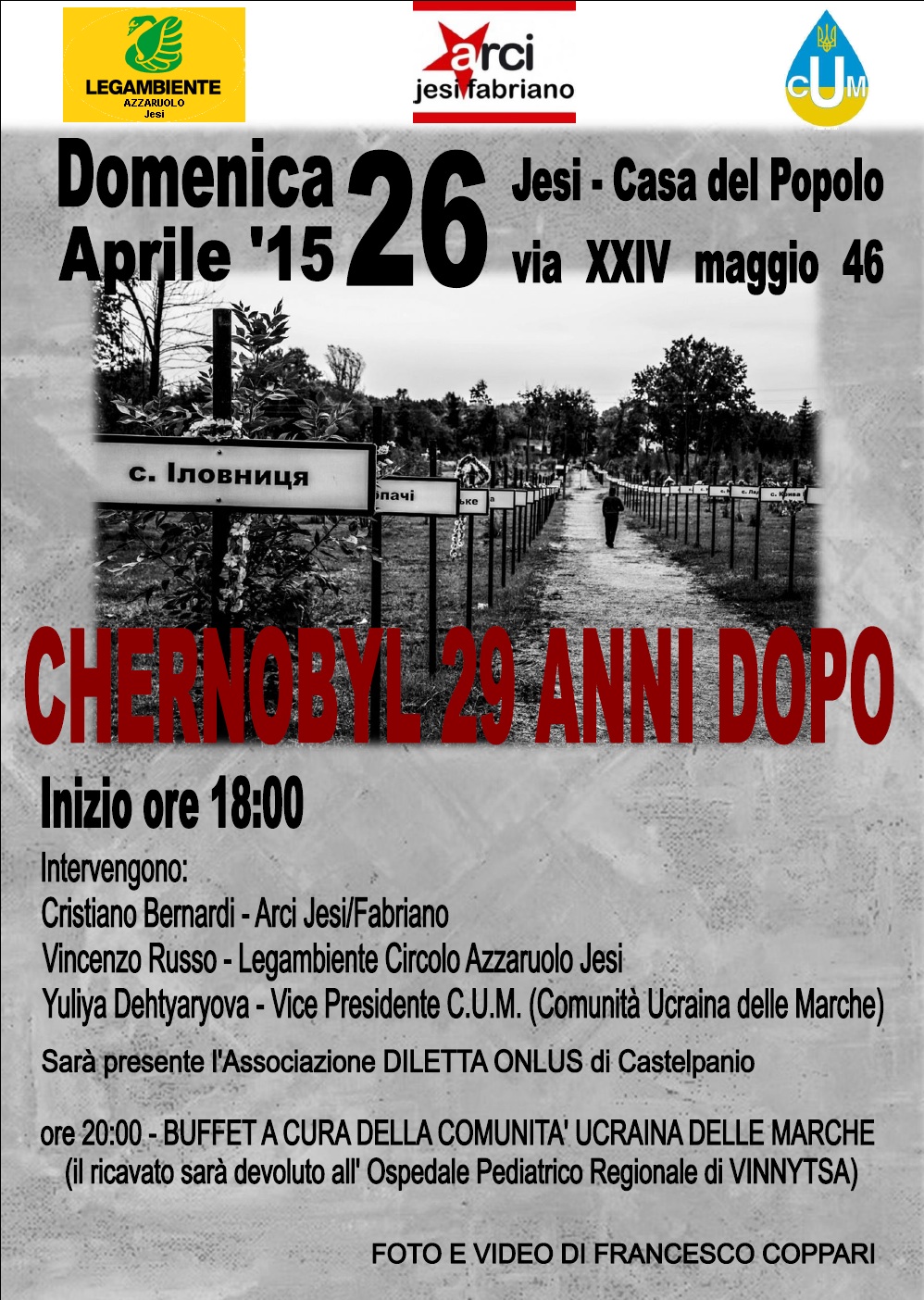 Arci Jesi-Fabriano propone insieme a Legambiente Jesi e a Comunita Ucraina nelle Marche, per domenica 26 aprile alle ore 18, un incontro dal titolo “Chernobyl 29 anni dopo” in cui interverranno il presidente di Arci Jesi-Fabriano Crsitiano Bernardi, Vincenzo Russo del Circolo Azzaruolo di Legambiente e Yuliya Dehtyaryova, vice presidente della C.U.M. L’incontro avrà luogo presso la Casa del Popolo di Jesi, in via XXIV Maggio 46, mentre alle 20 seguirà una cena buffet, sempre a cura della Comunità Ucraina delle Marche, il cui ricavato sarà devoluto all’Ospedale pediatrico regionale di Vinnytsa.