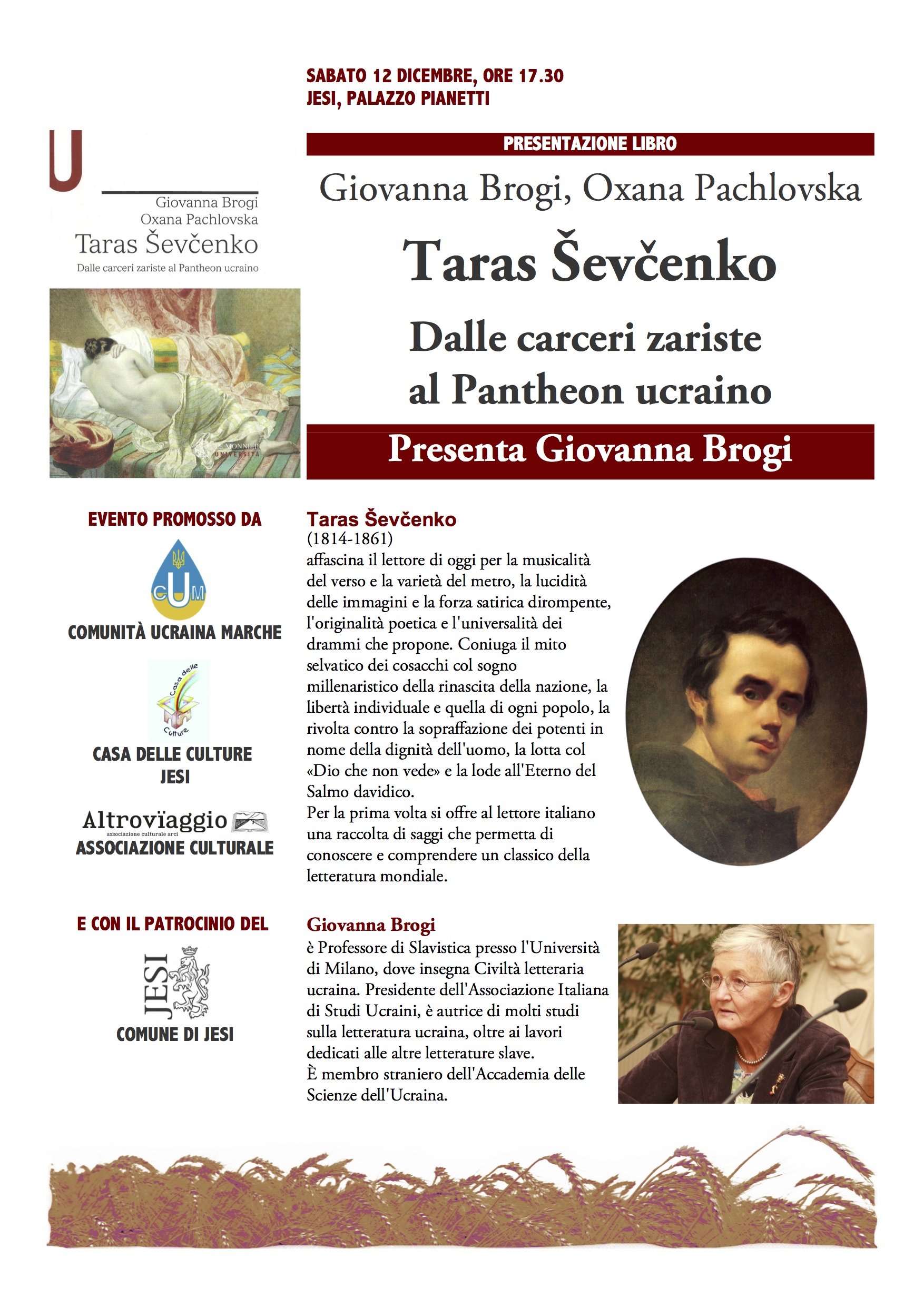 Le associazioni Arci “Casa delle culture” e “Altrovïaggio” e la Comunità Ucraina Marche, con il patrocinio del Comune di Jesi, promuovono la presentazione del libro di Giovanna Brogi e Oxana Pachlovska, Taras Ševčenko. Dalle carceri zariste al Pantheon ucraino. A presentare l’evento, in programma sabato 12 dicembre alle 17.30 a Palazzo Pianetti a Jesi, la stessa prof.ssa Giovanna Brogi.
