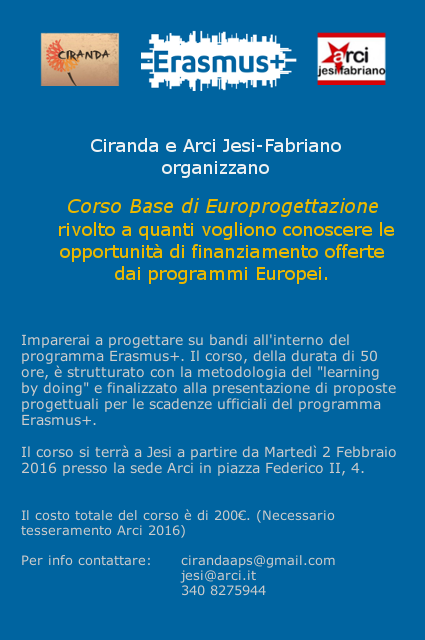 Martedì 2 febbraio 2016 alle ore 21:00, presso i locali del Comitato Arci Jesi-Fabriano in Piazza Federico II a Jesi (di fianco al Duomo), prenderà il via il Corso Base di Europrogettazione organizzato da Arci Jesi-Fabriano assieme all’Associazione Ciranda.