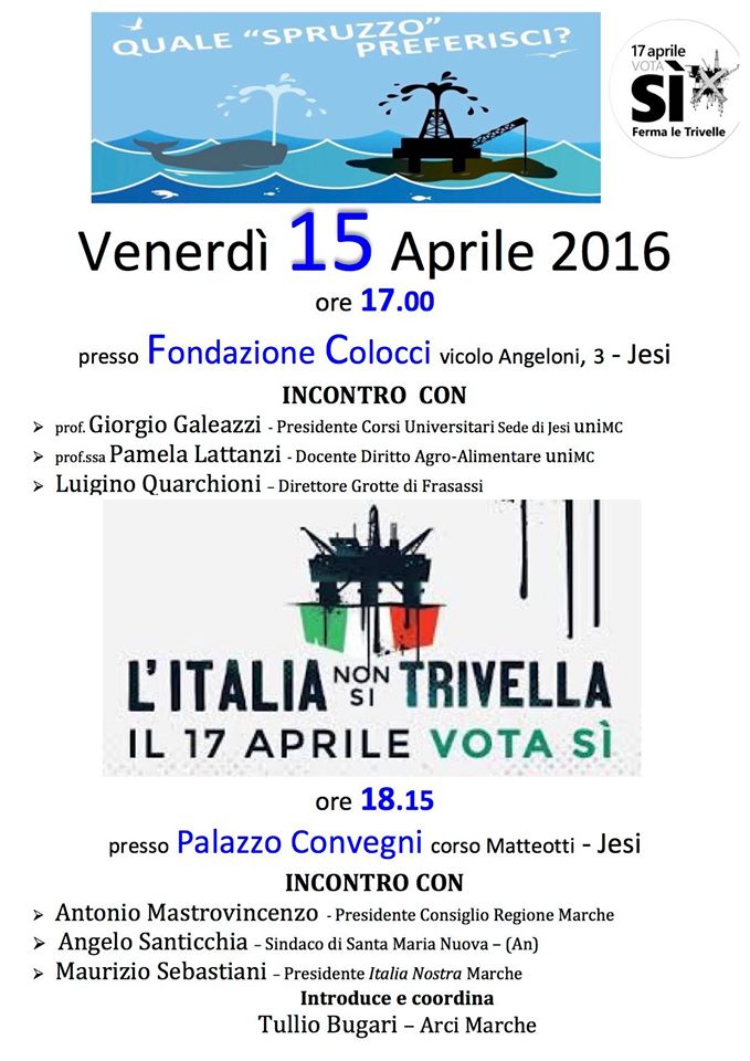 Questi importanti incontri pubblici, finalizzati ad informare i cittadini in vista del Referendum di domenica 17 aprile, sono stati organizzati dal comitato jesino “Vota Sì per fermare le trivelle”, al quale aderiscono associazioni e soggetti politici locali che hanno deciso di fare fronte comune.