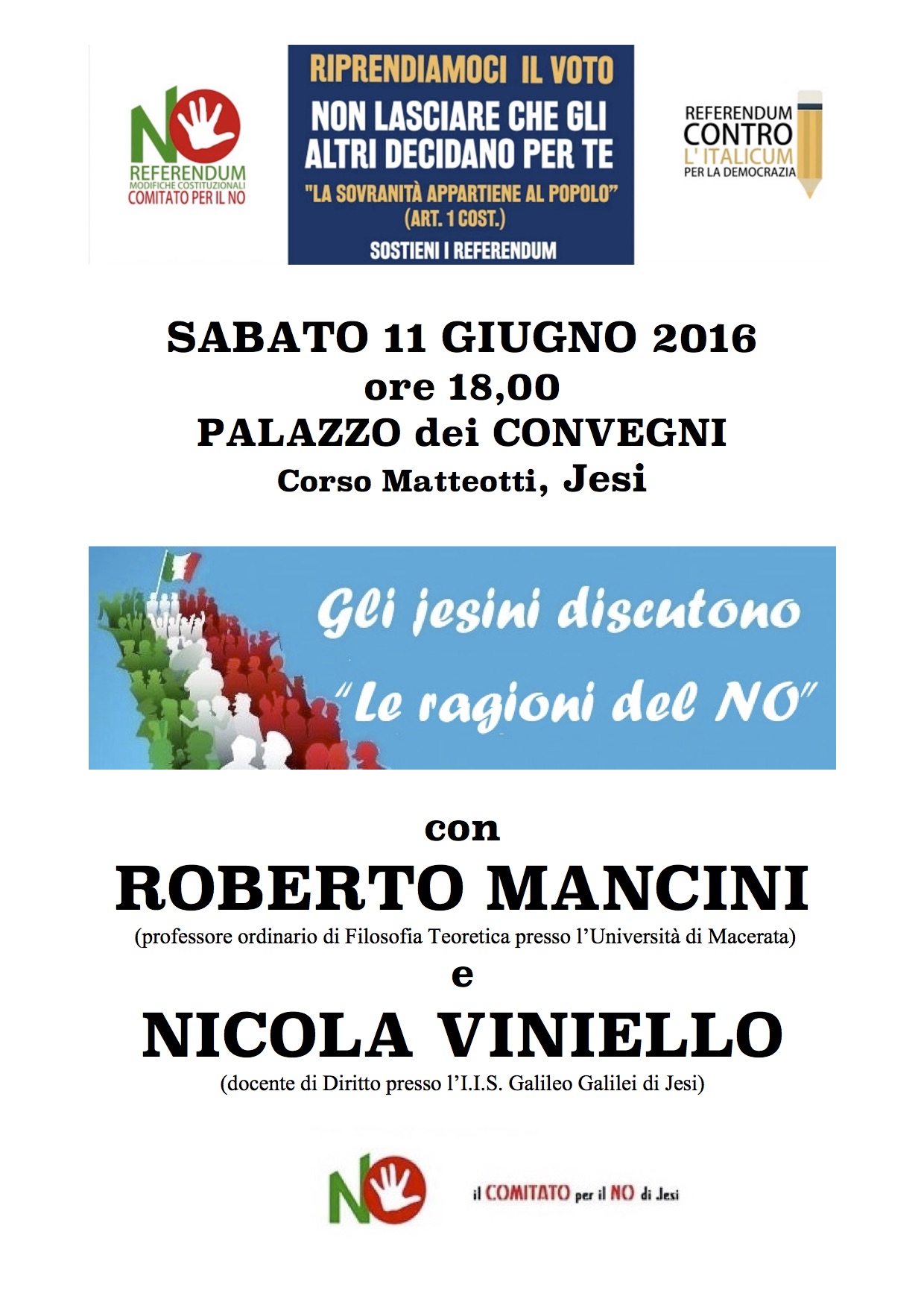 Il prossimo incontro per discutere “Le ragioni del NO” avrà luogo sabato 11 giugno al Palazzo dei Convegni di Jesi, in Corso Matteotti. Saranno presenti Roberto Mancini, professore di filosofia teoretica dell’Università di Macerata, e Nicola Viniello, docente di diritto dell’I.I.S. Galileo Galilei di Jesi.