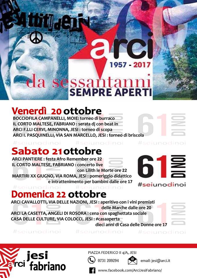 Il Comitato Territoriale Arci Jesi-Fabriano, per festeggiare questa ricorrenza, ha organizzato in alcuni dei circoli affiliati un’iniziativa che si svolgerà nel prossimo fine settimana dal 20 al 22 ottobre, con tanti eventi diversi in un’unica cornice. Proprio come è nello spirito dell’Arci (Associazione Ricreativa Culturale Italiana), che tiene insieme cultura, impegno sociale e divertimento, tutto nel nome della partecipazione.