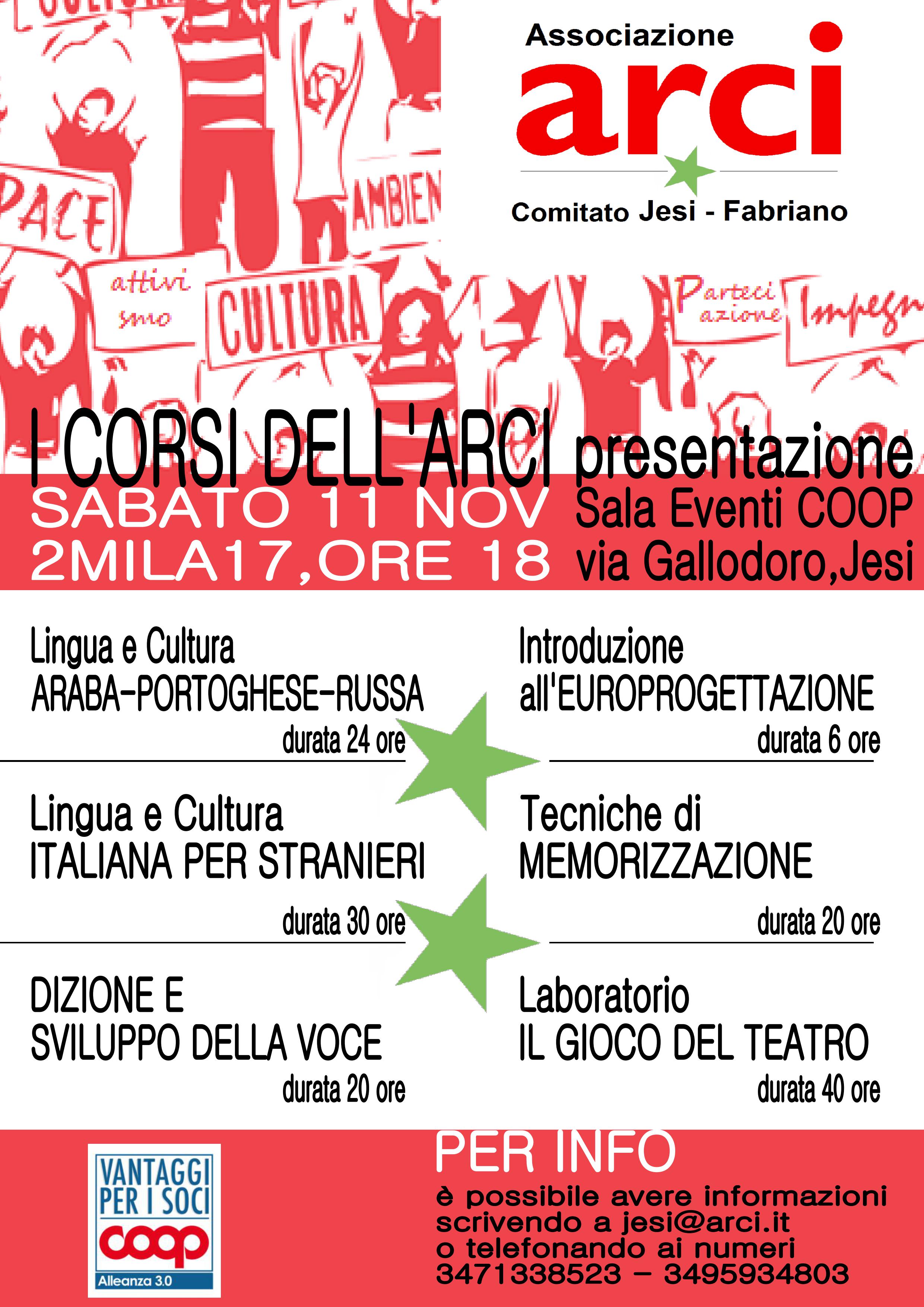 Saranno presentati sabato 11 novembre nella sala Eventi della Coop di via Gallodoro a Jesi, i corsi 2017/2018 dell’Arci Jesi-Fabriano.