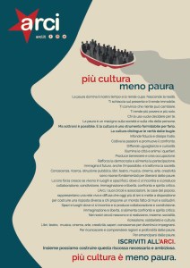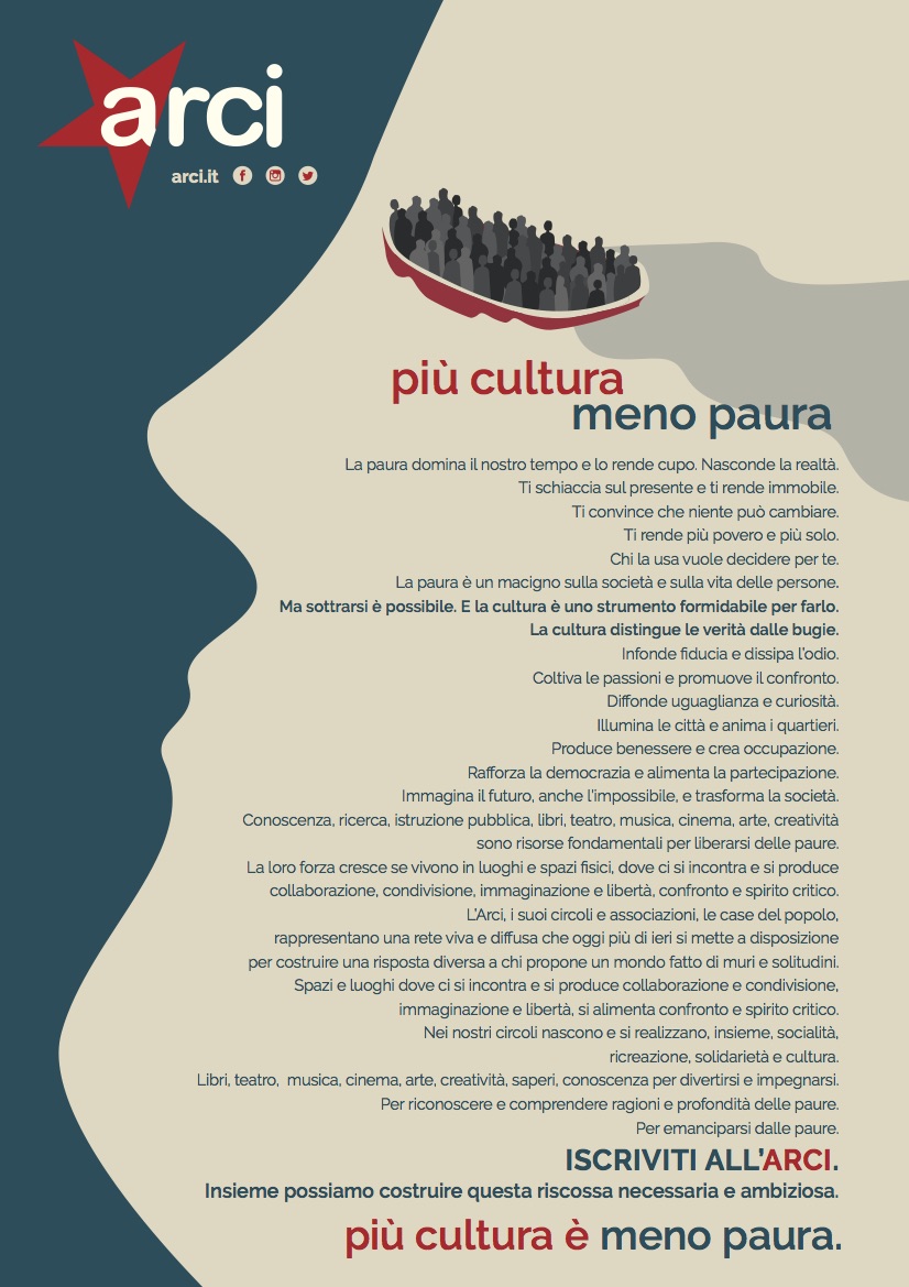 La paura domina il nostro tempo e lo rende cupo. Nasconde la realtà. Ti schiaccia sul presente e ti rende immobile. Ti convince che niente può cambiare. Ti rende più povero e più solo. Chi la usa vuole decidere per te. La paura è un macigno sulla società e sulla vita delle persone. Ma sottrarsi è possibile. E la cultura è uno strumento formidabile per farlo. La cultura distingue le verità dalle bugie. Infonde fiducia e dissipa l’odio. Coltiva le passioni e promuove il confronto. Diffonde uguaglianza e curiosità. Illumina le città e anima i quartieri. Produce benessere e crea occupazione. Rafforza la democrazia e alimenta la partecipazione. Immagina il futuro, anche l’impossibile, e trasforma la società. Conoscenza, ricerca, istruzione pubblica, libri, teatro, musica, cinema, arte, creatività sono risorse fondamentali per liberarsi delle paure. La loro forza cresce se vivono in luoghi e spazi fisici, dove ci si incontra e si produce collaborazione, condivisione, immaginazione e libertà, confronto e spirito critico. L’Arci, i suoi circoli e associazioni, le case del popolo, rappresentano una rete viva e diffusa che oggi più di ieri si mette a disposizione per costruire una risposta diversa a chi propone un mondo fatto di muri e solitudini. Spazi e luoghi dove ci si incontra e si produce collaborazione e condivisione, immaginazione e libertà, si alimenta confronto e spirito critico. Nei nostri circoli nascono e si realizzano, insieme, socialità, ricreazione, solidarietà e cultura. Libri, teatro, musica, cinema, arte, creatività, saperi, conoscenza per divertirsi e impegnarsi. Per riconoscere e comprendere ragioni e profondità delle paure. Per emanciparsi dalle paure.