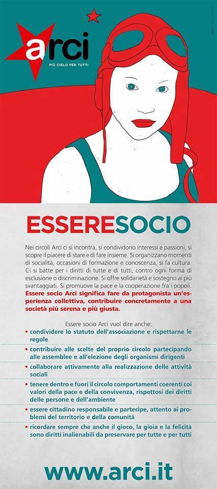 Hai scelto liberamente di diventare un socio dell’Arci e la tua tessera ti permette ora l’ingresso in un universo ricco e multiforme: l’universo dei circoli. Diventi così protagonista della nostra associazione; parte attiva con i suoi diritti e i suoi doveri; fruitore a pieno titolo di servizi e attività ma tu stesso impegnato a dare idee ed energie alla loro creazione e alla loro migliore qualità.